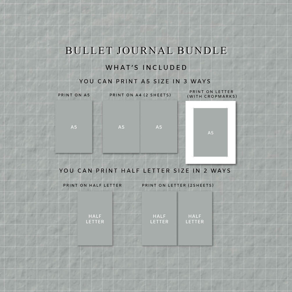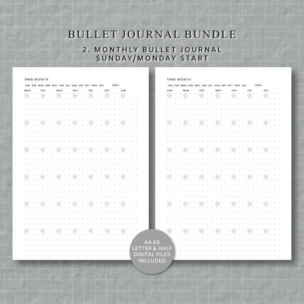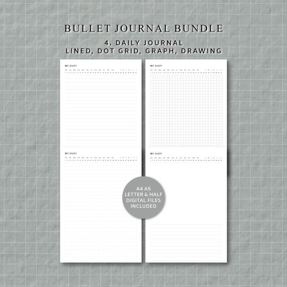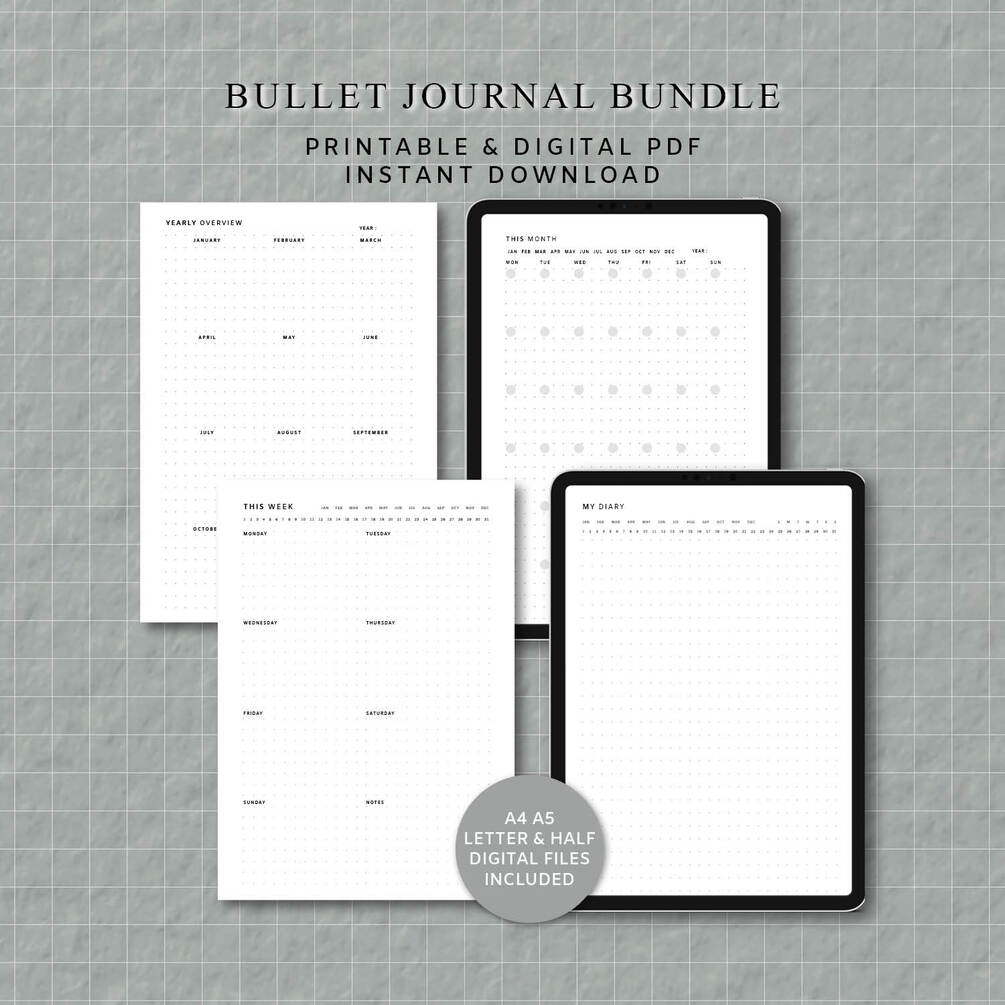 4-in-1 Bullet Journal Bundle, Yearly, Monthly, Weekly, Daily, Printable Planner Pages, iPad, reMarkable 2 Inserts, A4, A5, Letter & Half